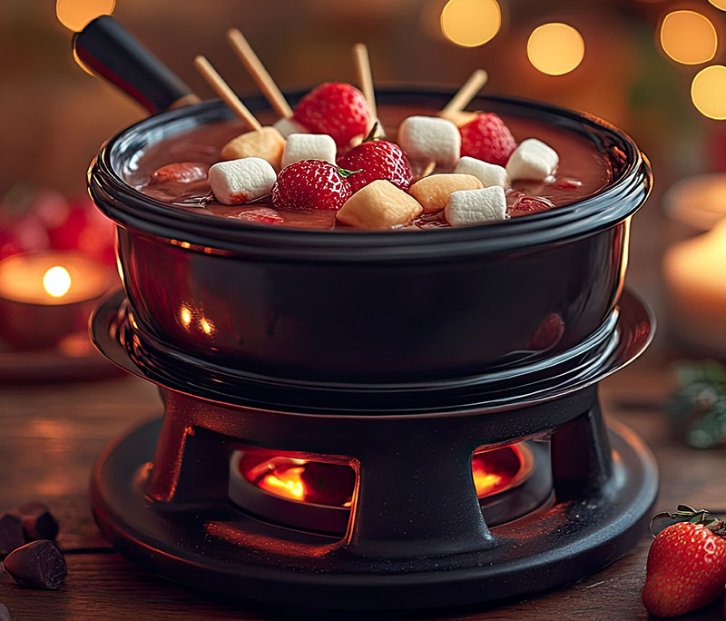Das kulinarische Herzstück: Fondue in bester Qualität – ob klassisch mit Käse, zartes Fleischfondue oder süßes Schokoladenfondue. Perfekt für kalte Abende, Weihnachtsfeiern, Afterwork, Freundesrunden oder romantische Dates.